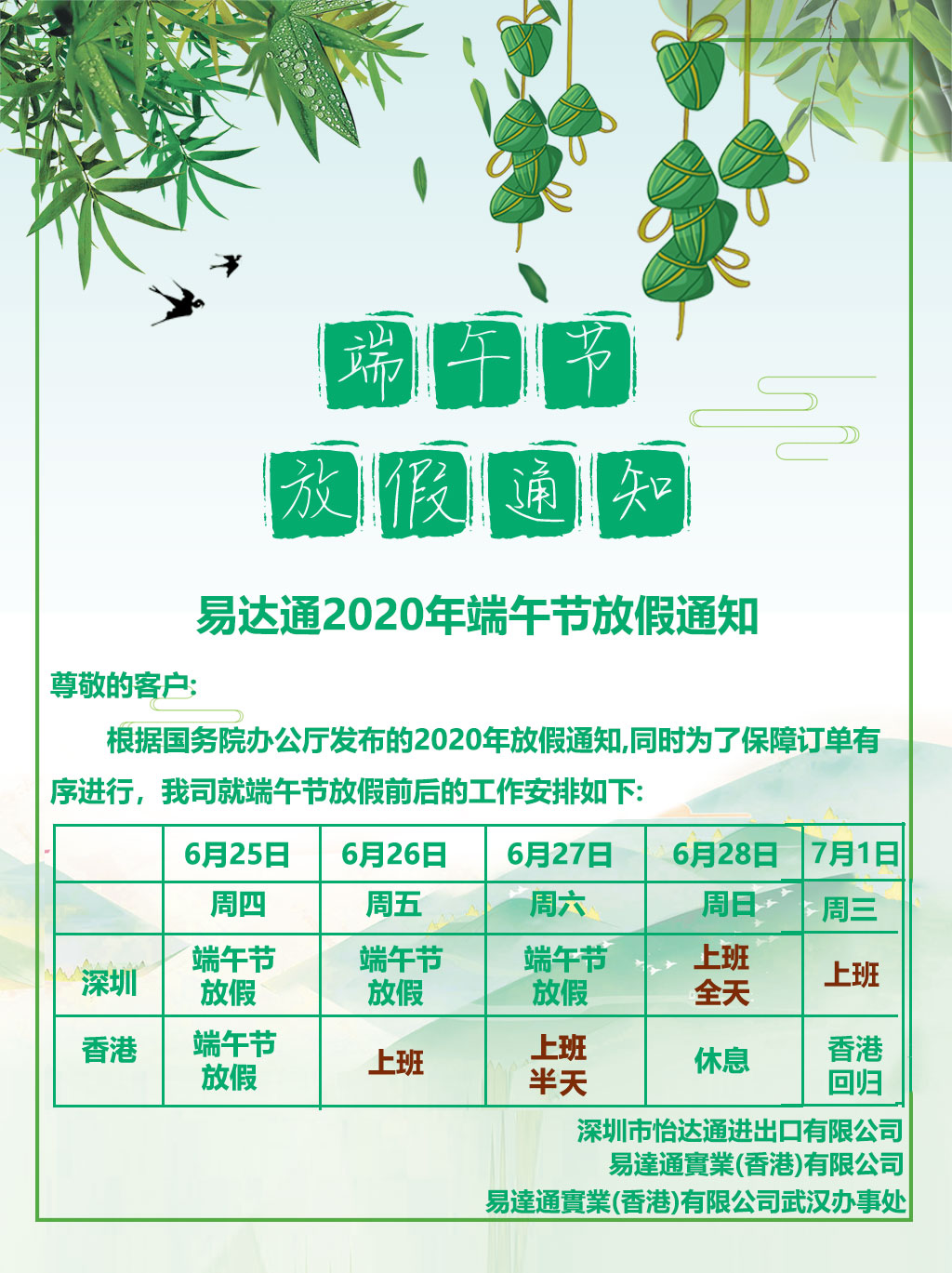 易達通2020年端午節(jié)放假安排